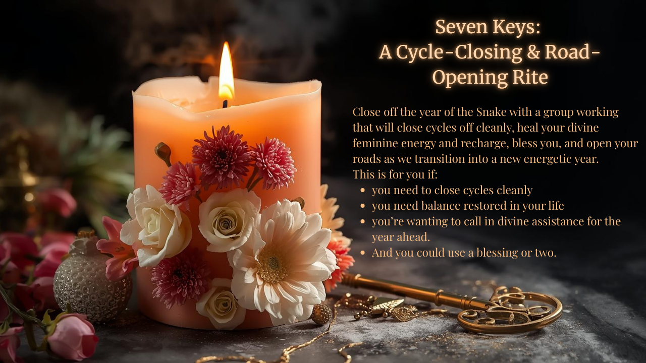 The Seven Keys Working is a group ritual designed to help you close out an old energetic cycle and open aligned pathways forward as we move into the Chinese New Year. This working focuses on seven core areas of life: clarity and decision-making, inner guidance, authority and boundaries, abundance and nourishment, relationships, purpose, and material stability. Together, we will release what no longer belongs to you, transmute lingering blocks or distortions, and open the road for aligned movement forward, through a blessing and road opening. This ritual is oriented to close out what is needing to be closed out for you now, transmute energies into what you are wanting to bring into the next year instead, to bring in divine guidance, bless and open the roads to specific areas of your life at this time. The ritual will include guided release, transmutation, prayer, and road-opening work. You do not need prior experience to participate — only the willingness to let go of what’s complete. This event is not one that is attended in any way- it will be performed in private, but I will be reaching out with images and musings after the ritual and any messages that came through. It is also non-refundable due to the nature of the working. If you’ve been feeling stuck, heavy, or like you’re standing at the edge of something new but can’t quite move yet, this working is for you. DISCLAIMER: This will change your life. It's success depends on your ability to carry out the guidance that comes with what you're asking for. You might see a lot of things shake and move- the year of the Snake will seek to close out things after this day, and so from the 13th to the 17th, you might see energies starting to close. This kind of magic can take time- especially with the blessing and road opening aspect, things need to be re-arranged for these blessings to land in your life and there needs to be space for these roads to open. This guidance will be coming in after the working is done, so any intuitive nudges or changes you feel you need to make in your life- follow through with them as they may be the divine guidance requested in the ritual. My energy does cause a lot of changes- so this is best if you're able to handle fast paced energy, changes at the root, and being very honest with yourself about what you're needing to move forward right now.